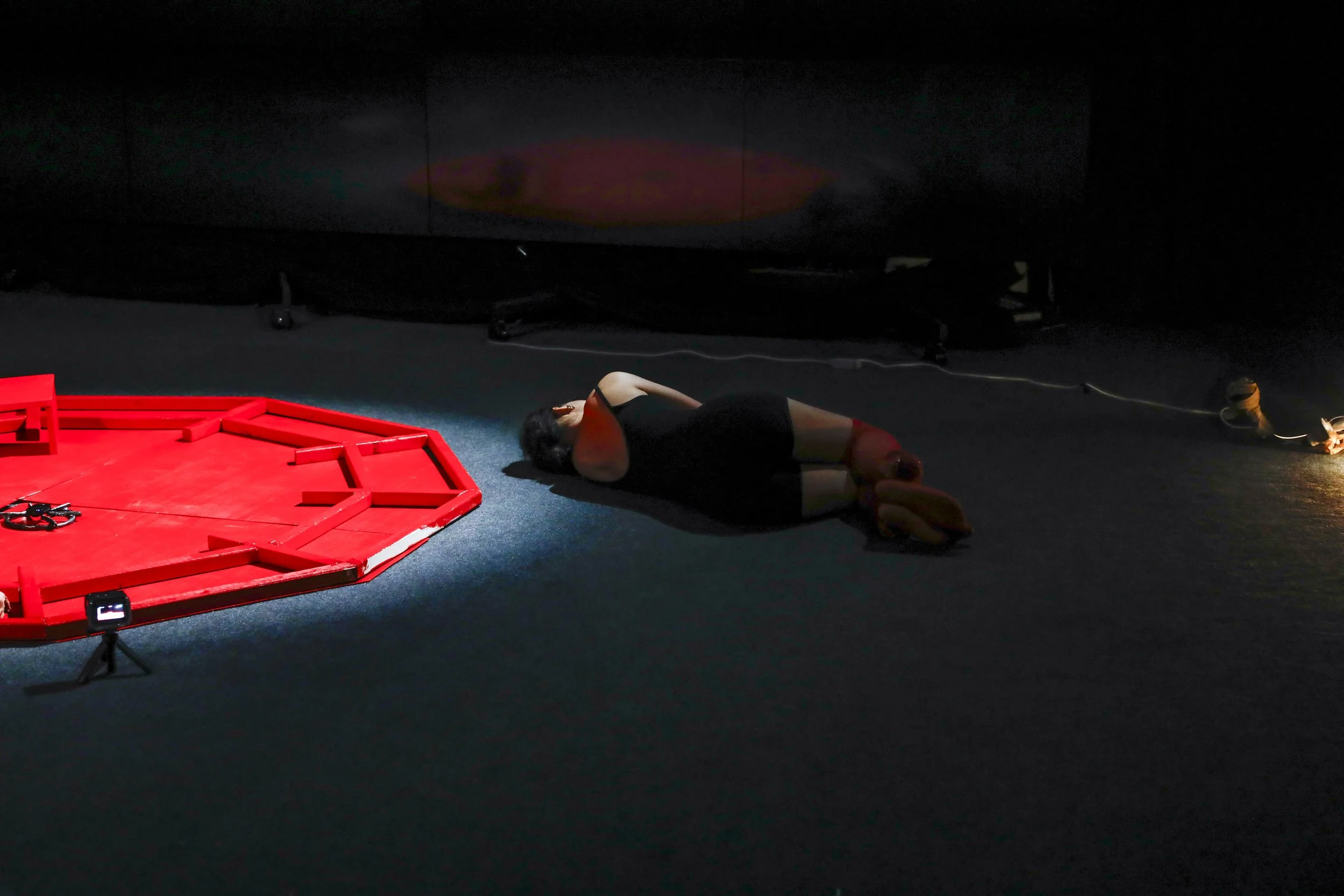 This is a collective performance combining video and live action. Four female performers enact ritualistic gestures drawn from childhood trauma, adolescent shame, bodily memory, and inherited folklore. The piece unfolds on a red platform and a small restraining stool that forces the body into a folded position.